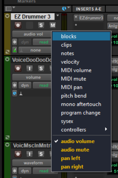 MIDI tracks (and their cousins, instrument tracks) have slightly different automation options than audio tracks do. The image to the right shows the automation options for EZ Drummer3, a virtual MIDI instrument.