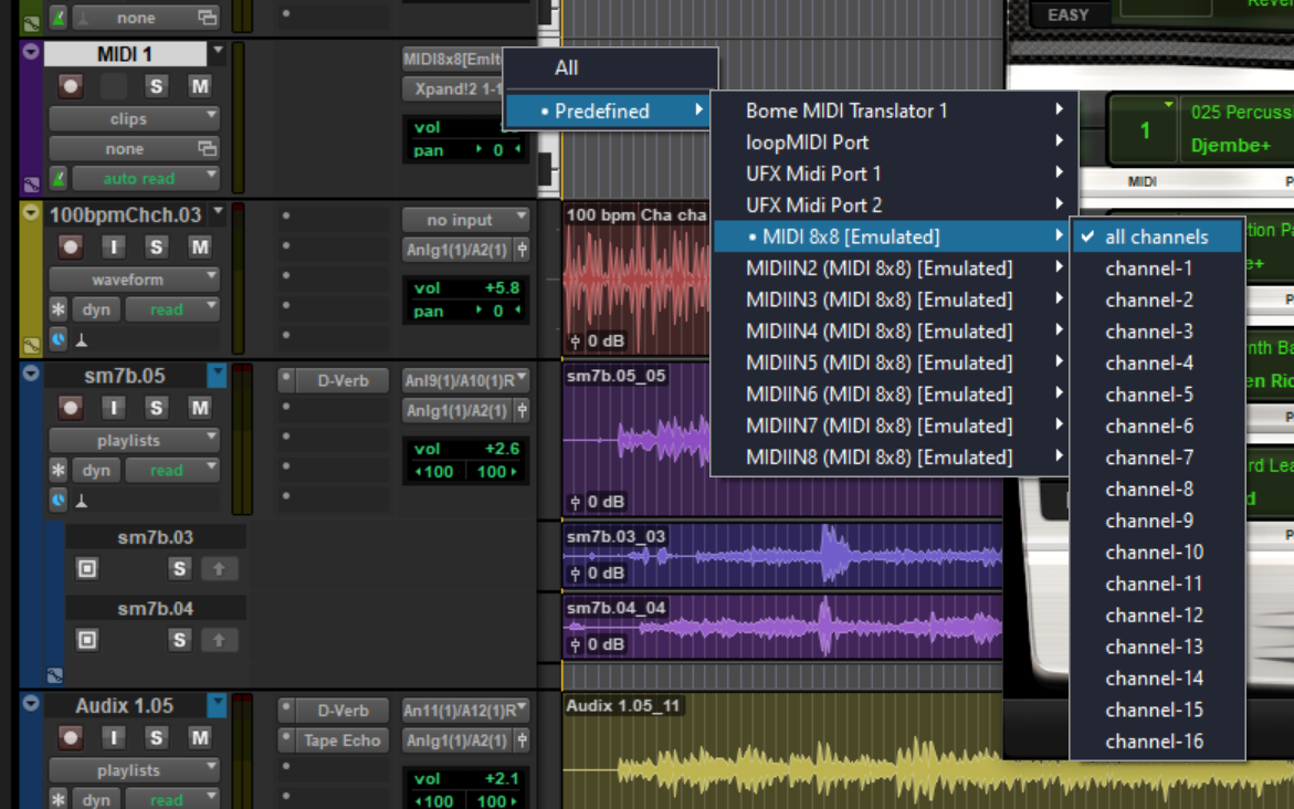 This section shows how to make a MIDI percussion track using Xpand!2, but the process is the same for other types of instruments with Xpand!2.