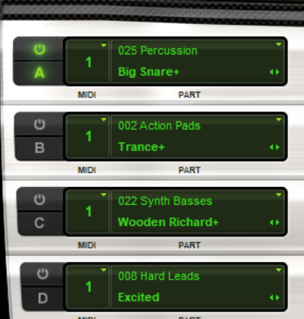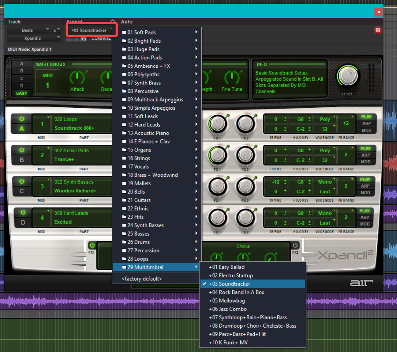 From the Preset pull-down menu at the top of the Expand!2 dialog, select 29 Multitimbral / 03 Soundtracker: