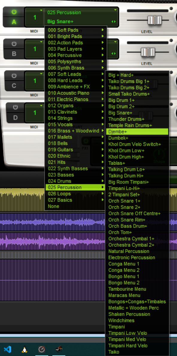 Click on the displayed instrument for channel A and select 025 Percussion / Djembe+