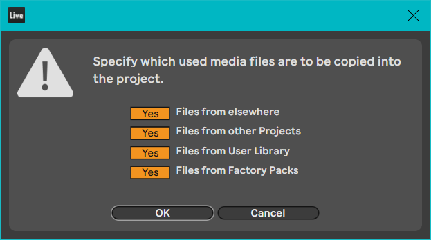 clips stored outside the Live set directory tree that had been dragged into the project will be copied into a subdirectory