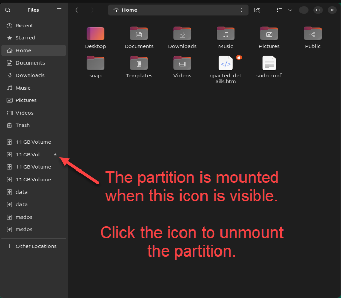 In Nautilus, click the icon next to each of the mounted file systems to dismount them.