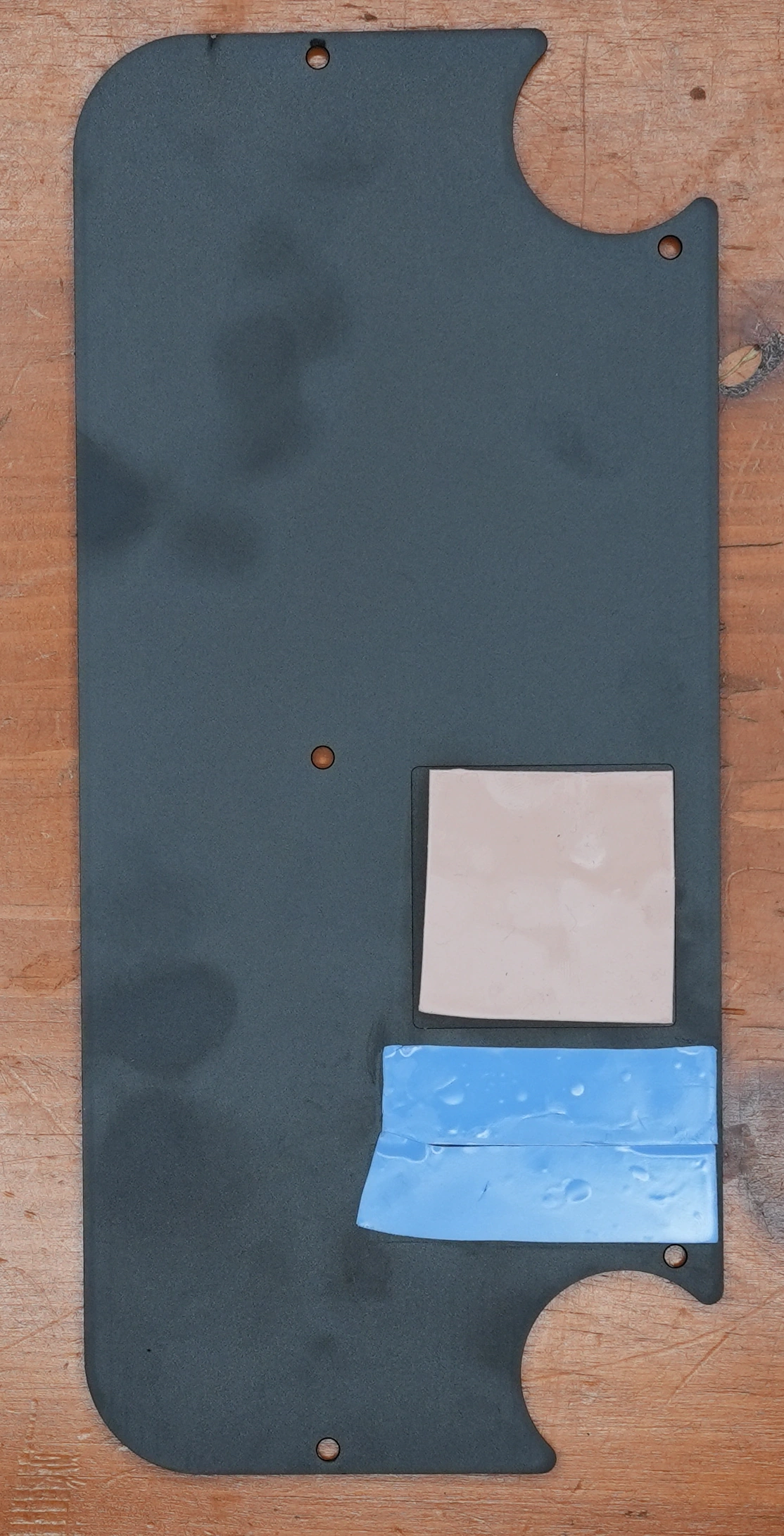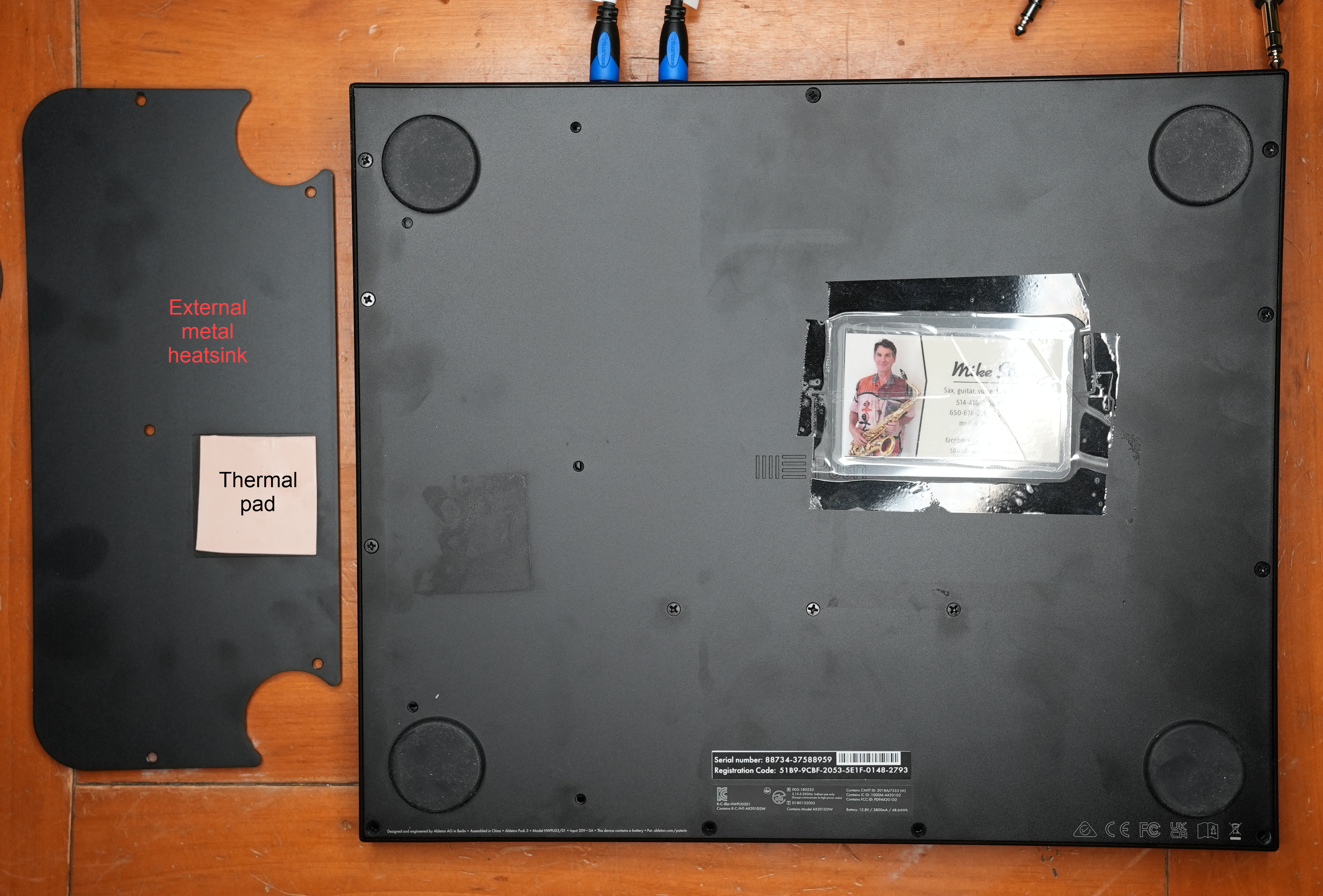 I felt that the new, larger and hotter NVMe drive would also benefit from a thermal pad on the other side of the bottom panel. This would help conduct the extra heat from the new NVMe drive to the external heat sink. You can see the two blue, 0.5 mm thick thermal pads that I added; I felt that more was better.