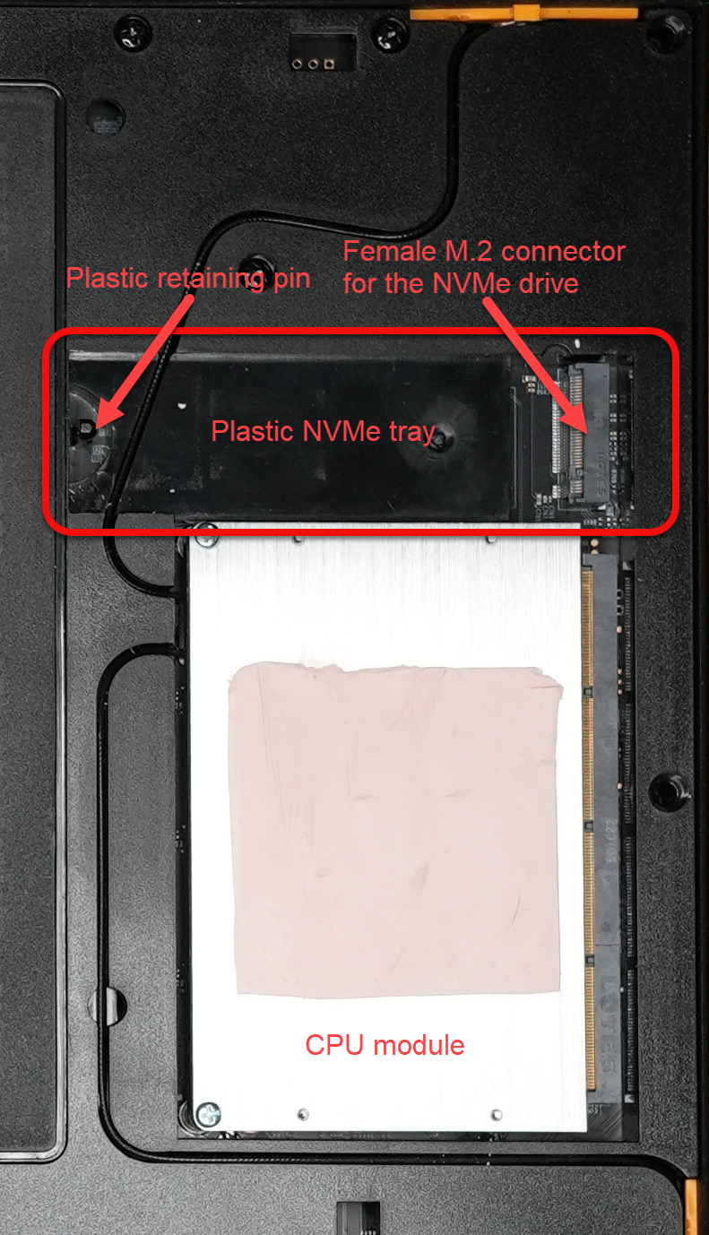 Viewing from the other end, so the writing on the NVMe is easily read, here is a closeup view of the NVMe drive and the CPU module: