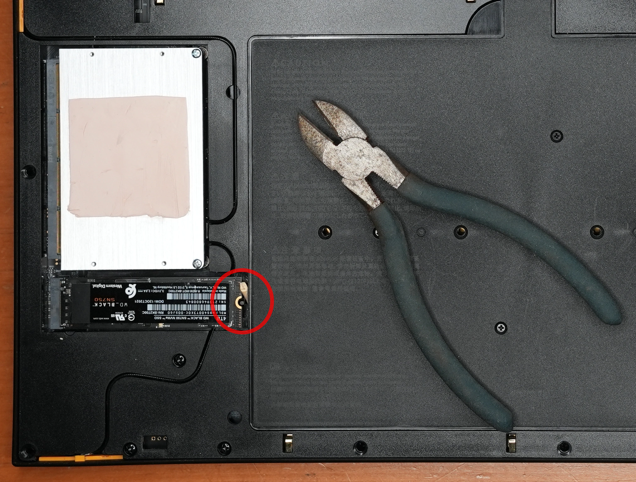 Higher-capacity NVMe drives like the SN750 have hardware on their bottom side, which means they are effectively thicker. I measured the thickness of the original P3S NVMe drive as 1.15 mm and the thickness of the SN750 as 3.46 mm. The depth of the drive bay is 3.87 mm.