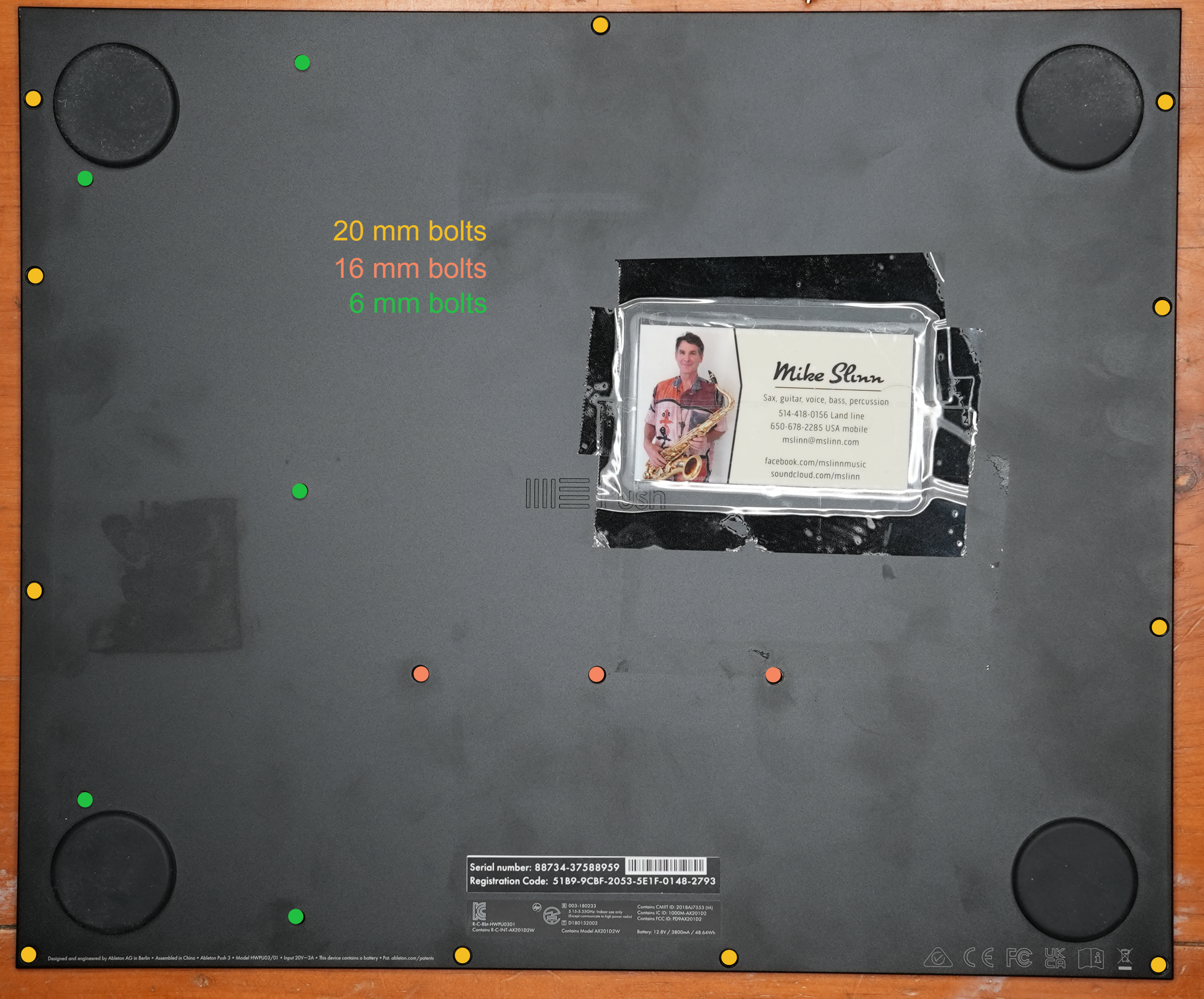This image shows the metal P3S backplate and all its boltholes. The 3 lengths of bolts are color-coded.