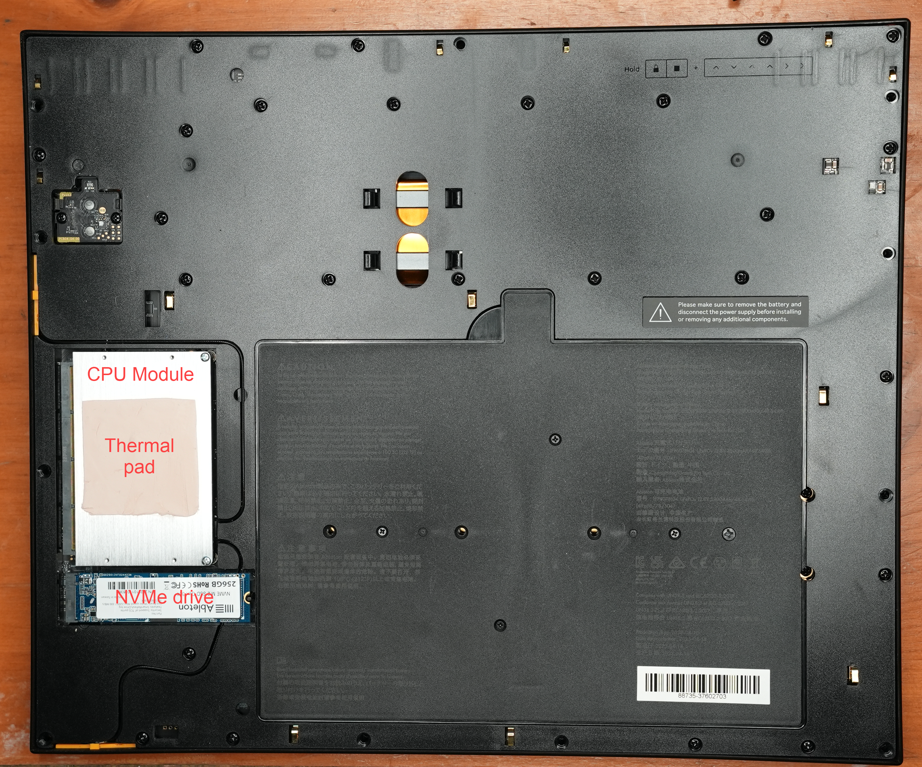 Now that the P3S bottom plate has been removed, we can see the NVMe drive and the CPU module. Notice that the CPU module has another pink thermal pad on top. This thermal pad diffuses heat from the CPU module through the P3S bottom plate. When the P3S is assembled and turned over, so the controls are on top, this thermal pad is directly above the thermal pad that we saw earlier.