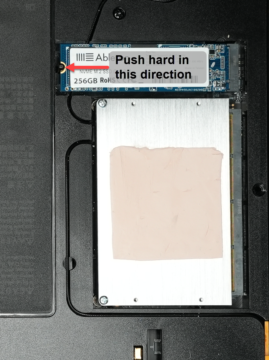 The red arrow in the following image points to the post that must be pushed hard to the left to pop out the NVMe drive.