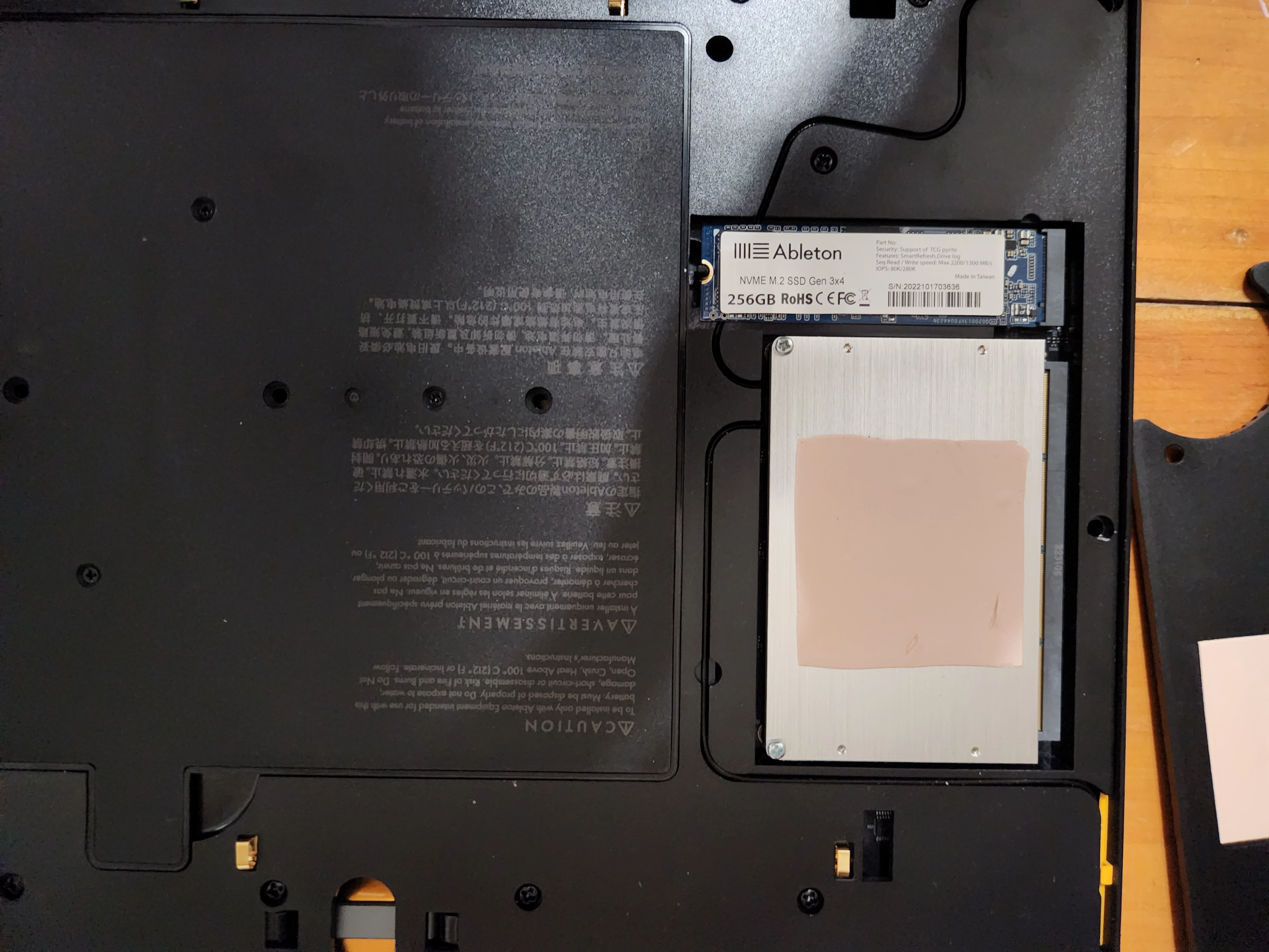 The tray that the NVMe sits in is made of plastic, which is a heat insulator as well as being electrically non-conductive. This is unfortunate because the only way that an NVMe might be cooled when placed in such a tray is through thermal conduction, drawing heat from the top-side of the NVMe drive and dispersing it to the heavy P3S bottom plate. The CPU module is cooled in this manner. However, Ableton does not provide a means of cooling the NVMe drive; fortunately, this is easily remedied by placing a thermal pad of the appropriate thickness on the NVMe drive.