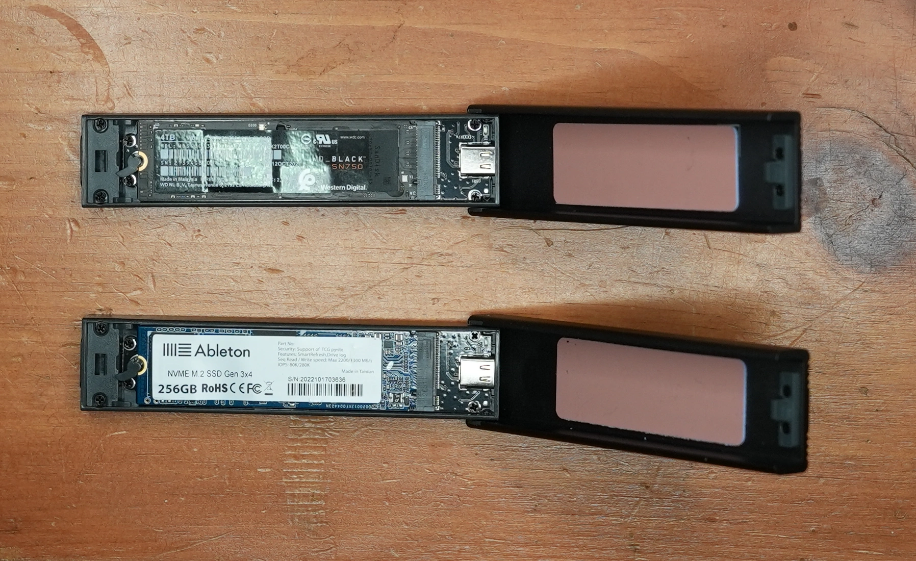 The next two images show the original NVMe from Ableton next to the replacement NVMe. You can see the gold-colored metal contacts of the male M.2 connectors on both NVMes. This is the top view: