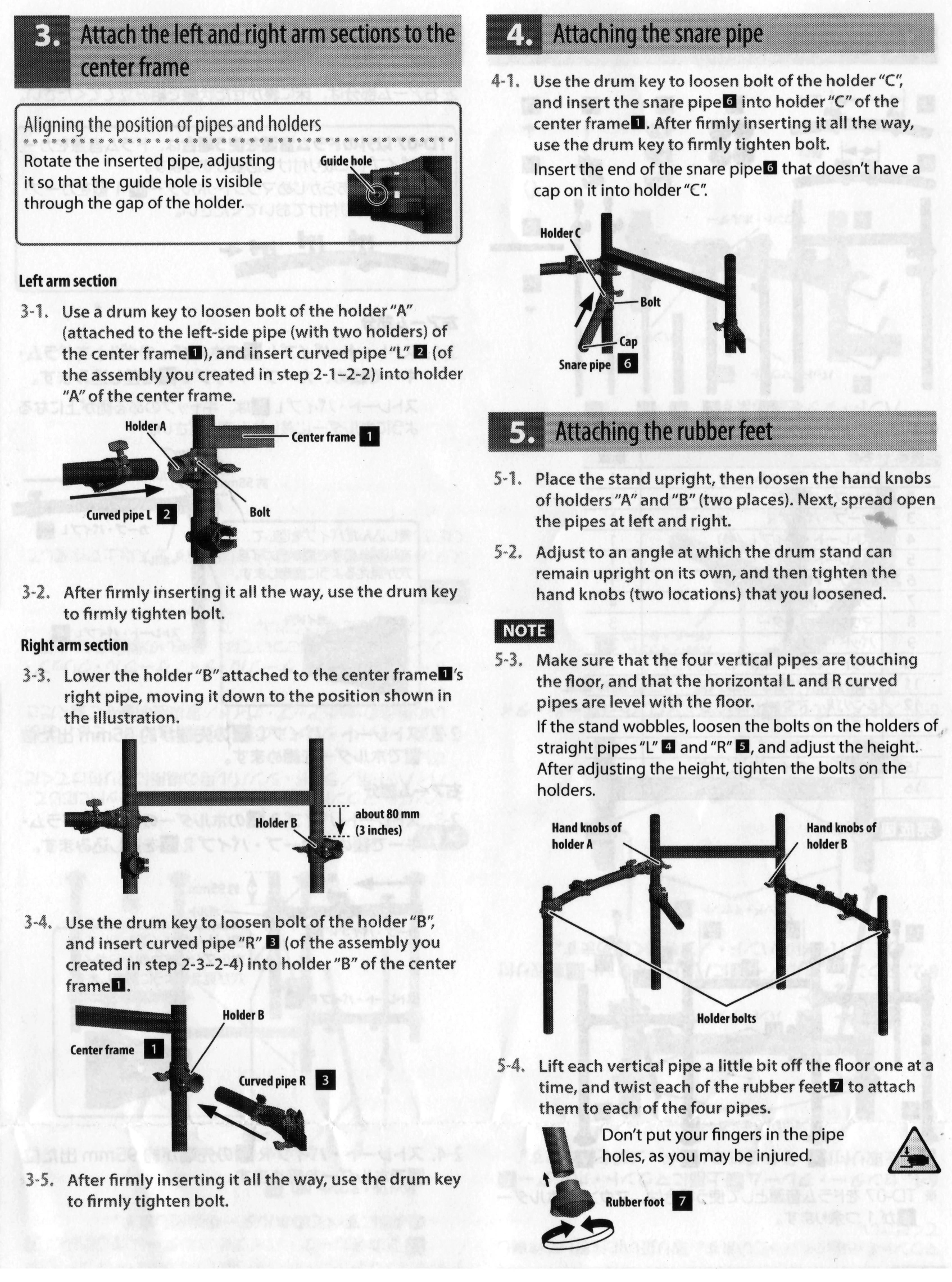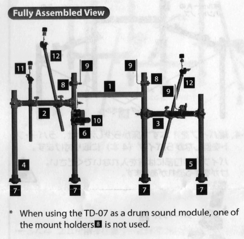 The VQD106 Setup Guide and the YouTube video by Roland entitled “Assembling the VQD106” do not follow the same sequence. In the video, the snare pad is attached next, but the VQD106 Setup Guide shows how to assemble the kick drum next, and then it refers readers to the individual owner’s manuals for each component. I decided to follow the video sequence and refer to the individual owner’s manuals for further details.