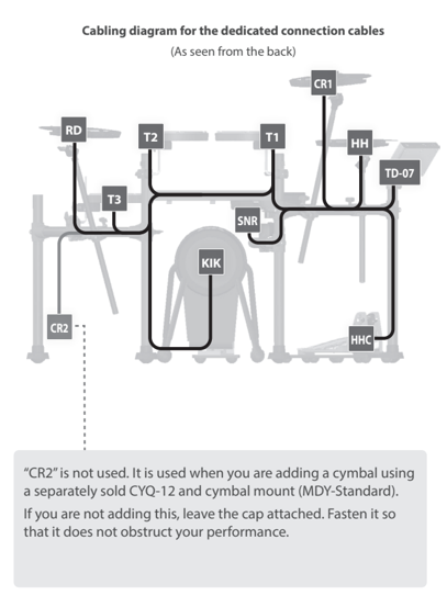 Length Sensor Color Label TR/TRS 43.5" Left-most tom Blue T1 TR 44" Hi-hat Yellow HH TR 51.5" Snare Red SNR TRS 55.5" Left-most cymbal Green CR1 TRS 59" Right-most tom Blue T2 TR 79" (has a cap on it) not used Green CR2 TRS 79" Right-most cymbal Bright green RD TRS 79" Hi-hat pedal Amber HHC TRS 79" Kick drum Black KIK TR Videos