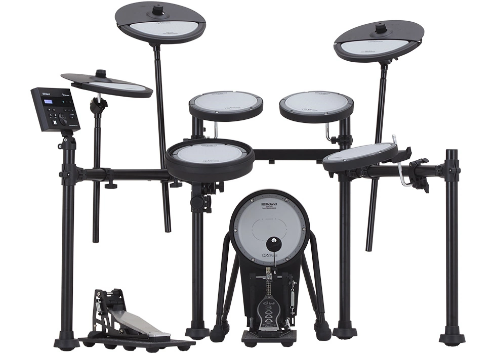 The Roland bass V-drum is a reasonable facsimile of a real bass drum. The cymbals, including the hi-hat, are also quite similar (minus the bell).
