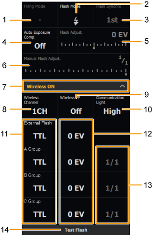 When [ON] is set, the wireless flash setting menu (8 - 14) is displayed.