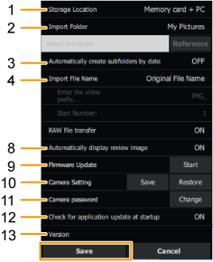 - Allows you to select the card in the camera, PC, or both as the storage location(s) of images.