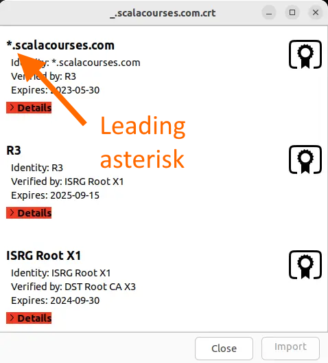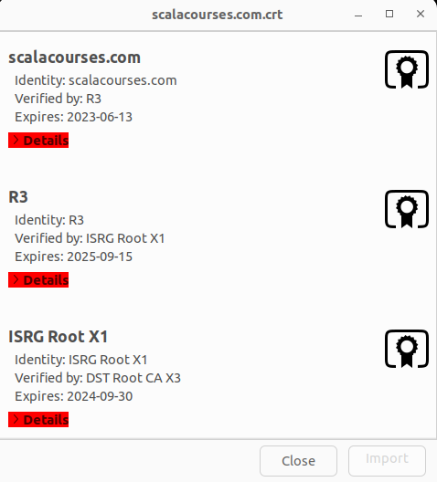 As you can see, this is a combined certificate, containing not just one certificate, but an entire certificate chain. Clicking on any of the red > Details buttons causes more information to be displayed about the corresponding certificate in the chain.