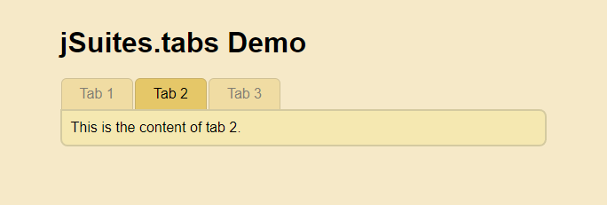 <html> <head> <link rel="stylesheet" href="https://cdn.jsdelivr.net/npm/jsuites/dist/jsuites.min.css" type="text/css" /> <style> body { background-color: rgba(242, 215, 158, 0.55); font-family: "Helvetica Neue", Helvetica, Arial, sans-serif; font-size: 16px; margin-left: 10%; margin-top: 2em; width: 80%; } .jtabs-content { background-color: #F7E8B4; border: 2px solid rgba(102, 102, 102, 0.226); border-radius: 0 8px 8px 8px; padding: 10px; } .jtabs .jtabs-headers { div { border-color: rgba(102, 102, 102, 0.226); border-style: solid; border-width: 1px 1px 0 1px; border-top-left-radius: 6px; border-top-right-radius: 6px; margin-left: 6px; } div:not(.jtabs-selected) { background-color: rgba(216, 162, 1, 0.184); color: rgba(102, 102, 102, .8); } div.jtabs-selected { background-color: rgba(216, 162, 1, 0.479); color: black; } } </style> </head> <body> <h1>jSuites.tabs Demo</h1> <div class="jtabs"> <div id="jtabs-headers"> <div id="tab1">Tab 1</div> <div id="tab2">Tab 2</div> <div id="tab3">Tab 3</div> </div> <div id="jtabs-content"> <div> This is the content of tab 1. </div> <div> This is the content of tab 2. </div> <div> This is the content of tab 3. </div> </div> </div> </body> <script defer src="https://cdn.jsdelivr.net/npm/jsuites/dist/jsuites.min.js"></script> <script> document.addEventListener('DOMContentLoaded', function() { jtabs = jSuites.tabs(document.getElementsByClassName('jtabs')[0]); // The following two statements accomplish the same task: open tab 2 // jtabs.open(1); // origin 0 //jtabs.selectIndex(document.getElementById("tab2")); // The following opens tab2 if the URL ends with #tab2 const desiredTab = window.location.hash.split('#')[1]; if (typeof desiredTab !== 'undefined') jtabs.selectIndex(document.getElementById(desiredTab)); }); </script> </html>