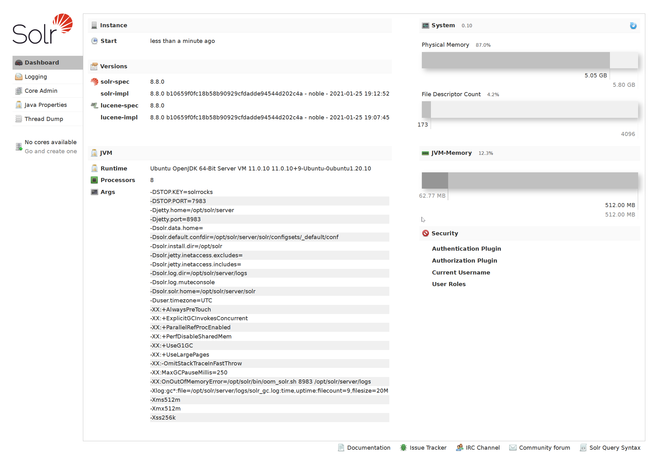 Solr process 2818 running on port 8983 { "solr_home":"/opt/solr/server/solr", "version":"8.8.0 b10659f0fc18b58b90929cfdadde94544d202c4a - noble - 2021-01-25 19:12:52", "startTime":"2021-02-12T12:22:42.968Z", "uptime":"0 days, 0 hours, 2 minutes, 49 seconds", "memory":"38.9 MB (%7.6) of 512 MB"}