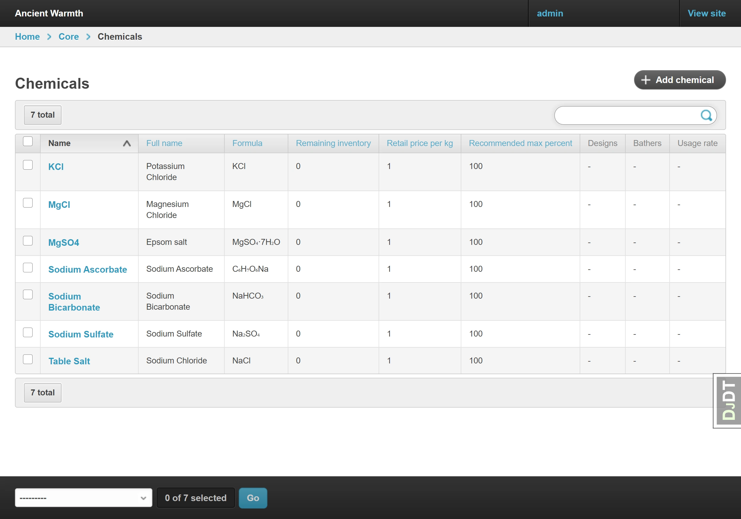 This is the list page for my Ancient Warmth http://localhost:8000/adminpricing/chemical/