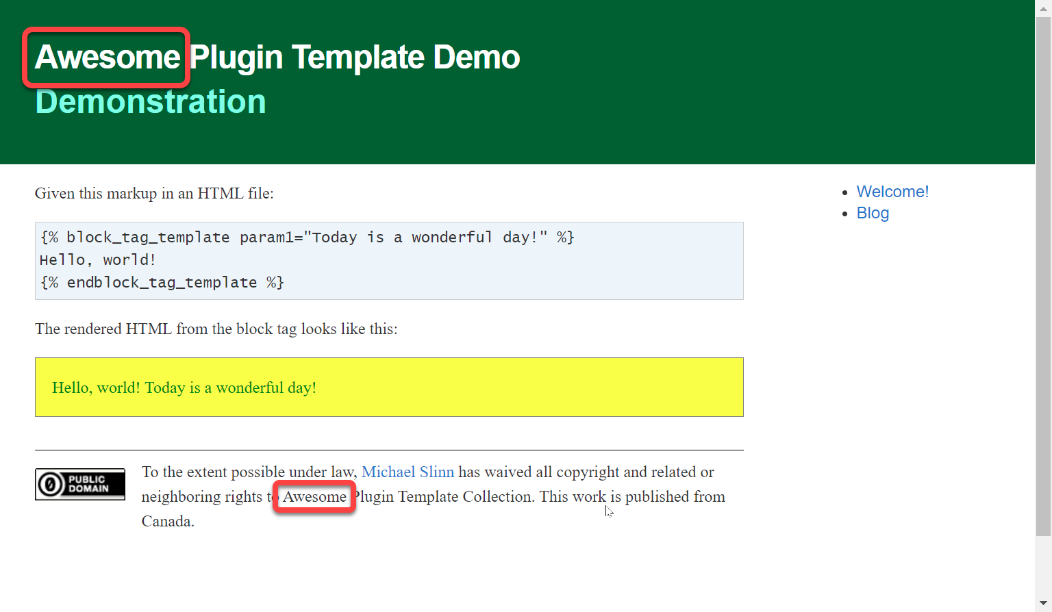 module JekyllPluginHookExamples def modify_output Proc.new do |webpage| webpage.output.gsub!('Jekyll', 'Awesome') end end module_function :modify_output Jekyll::Hooks.register(:documents, :post_render, &modify_output) Jekyll::Hooks.register(:pages, :post_render, &modify_output) end