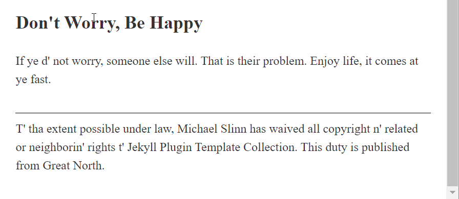 <h2>Don't Worry, Be Happy</h2> <p> If ye d' not worry, someone else will. That is their problem. Enjoy life, it comes at ye fast. </p> <p class="copyright" id="copyright" xmlns:dct="http://purl.org/dc/terms/" xmlns:vcard="http://www.w3.org/2001/vcard-rdf/3.0#"> T' tha extent possible under law, Michael Slinn has waived all copyright n' related or neighborin' rights t' Jekyll Plugin Template Collection. This duty is published from Great North. </p>