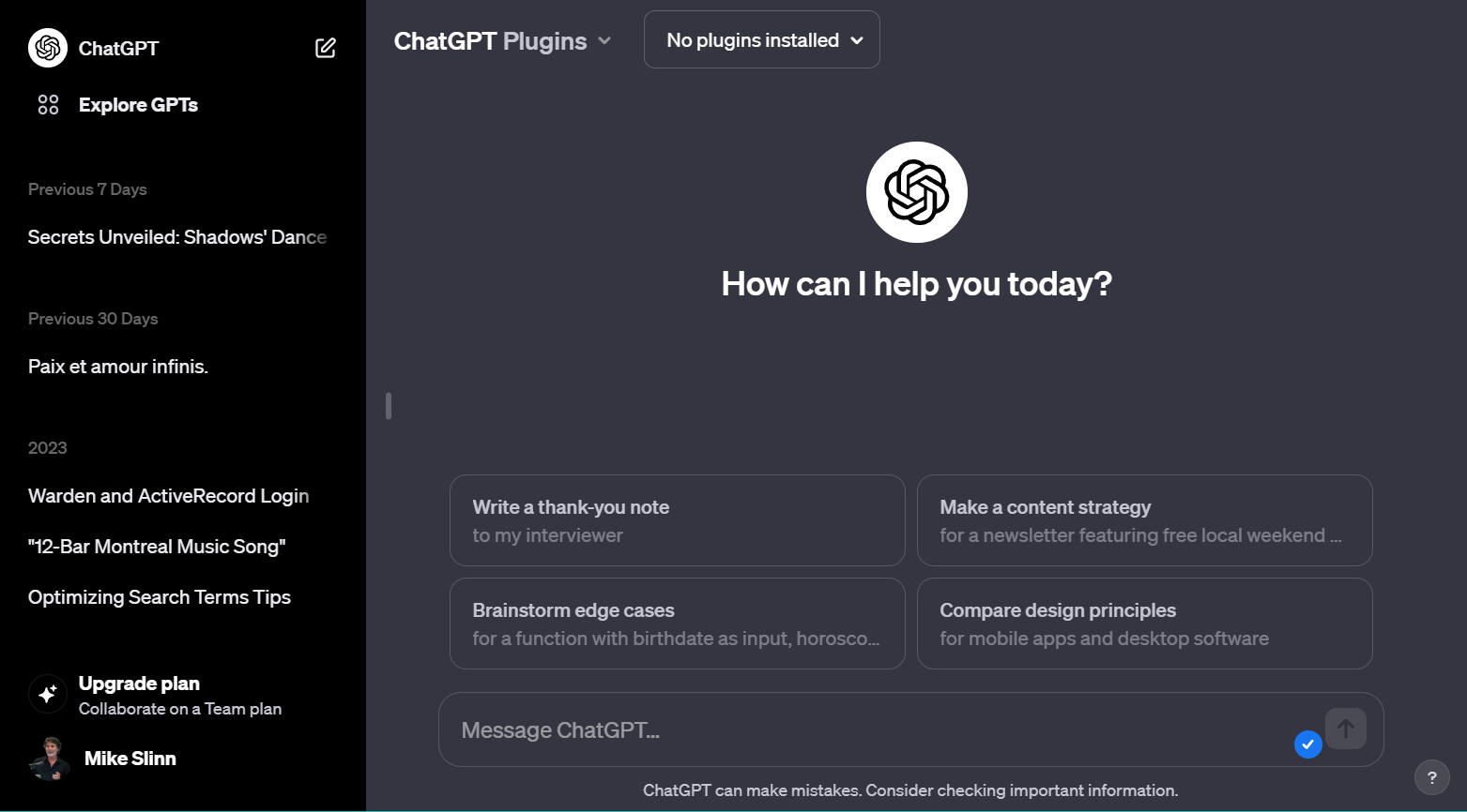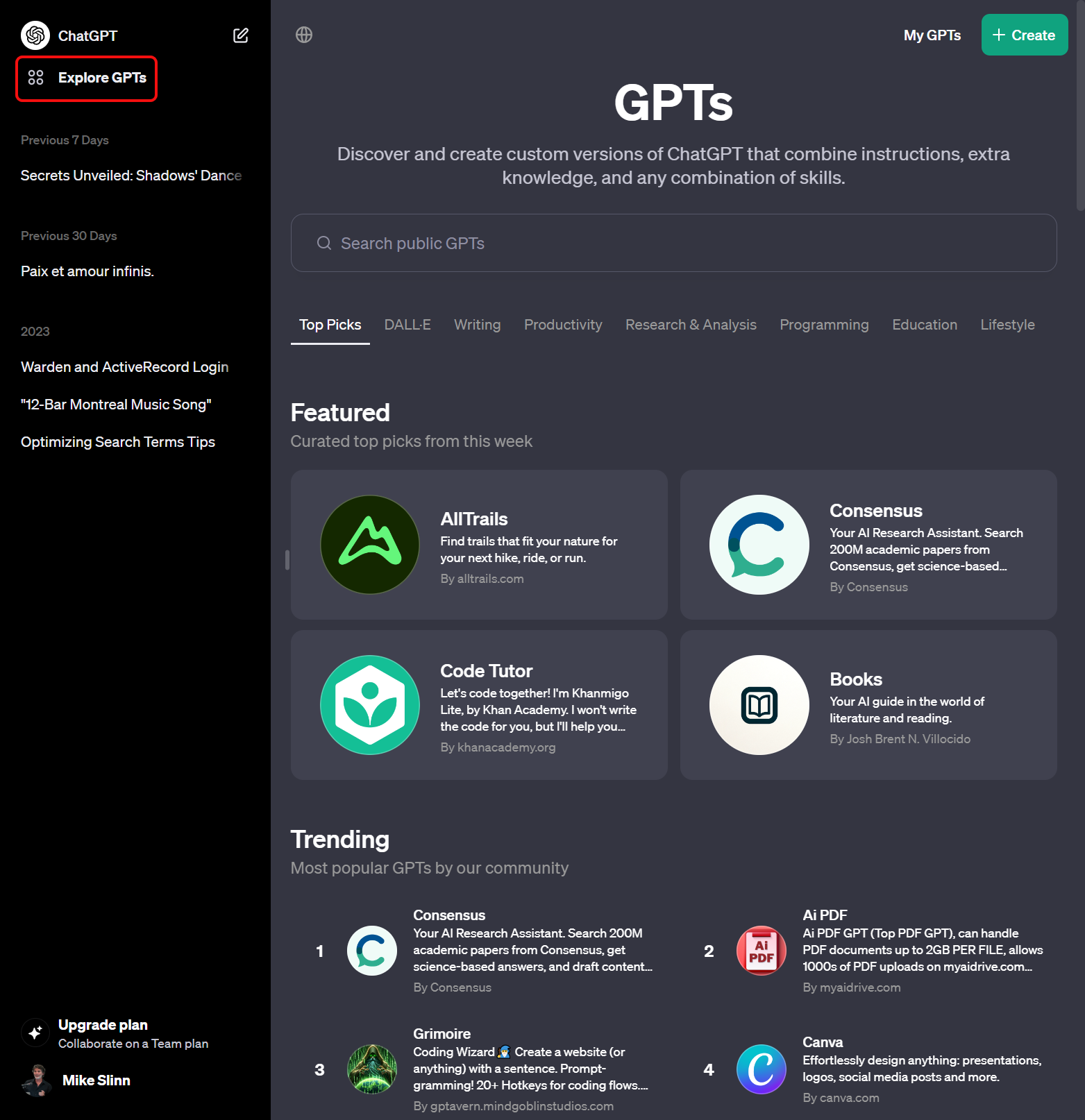 I signed up for the $20/month USD Plus subscription. That took me to the ChatGPT page, and I clicked on Explore GPTs.
