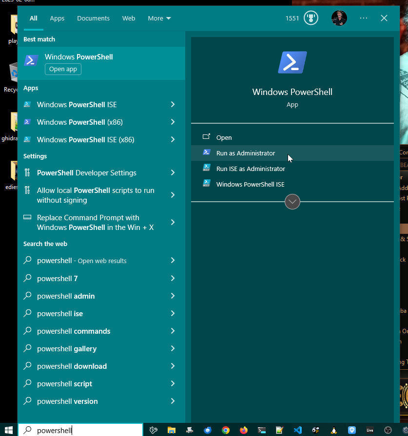 Launch PowerShell by typing Windows, typing