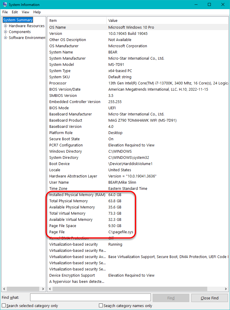 You can use System Information to quickly view the memory and virtual memory parameters of your Windows computer.