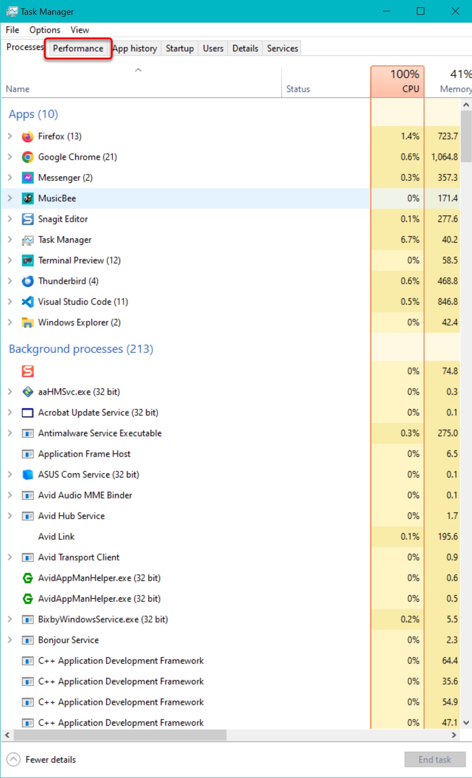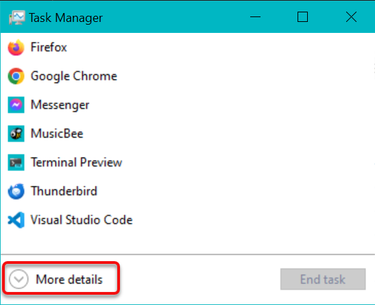 View the more detailed, and larger display layout for Windows Task Manager by clicking on More details as shown in the above image. The window will grow substantially, and several tabs will be shown at the top of the window. Click on the Performance tab as shown in the next image.