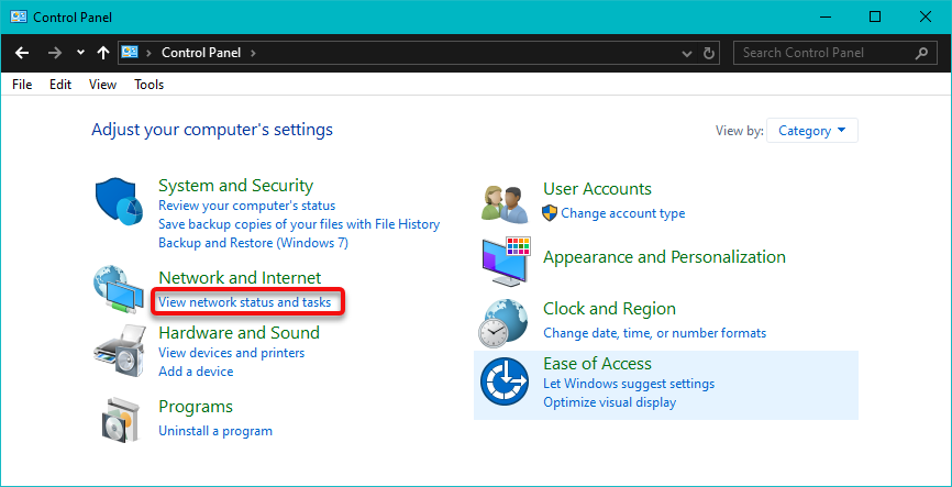 - Find the Network and Internet section and click on View network status and tasks, which will display the Network and Sharing Center.