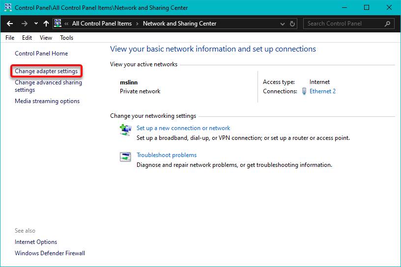 Click on Change adapter settings in the left-hand menu.