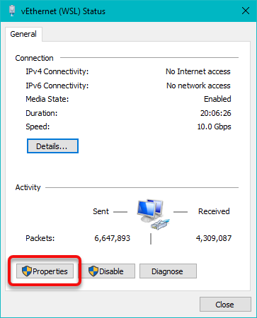 Another new window will open called vEthernet (WSL) Status.
