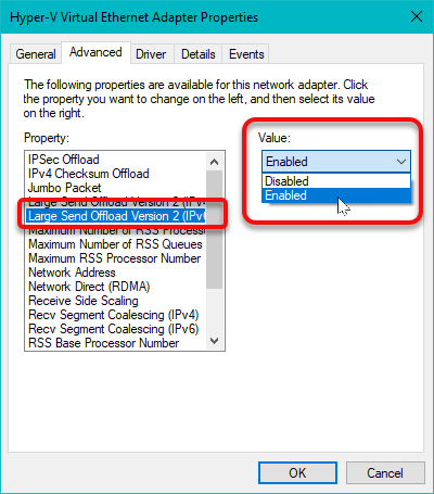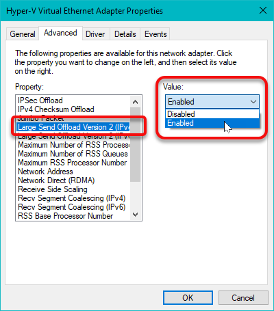 Select Large Send Offload Version 2 (IPv4) and change the drop-down to disabled.