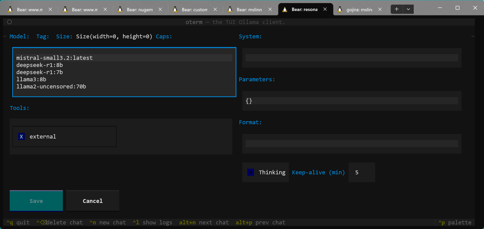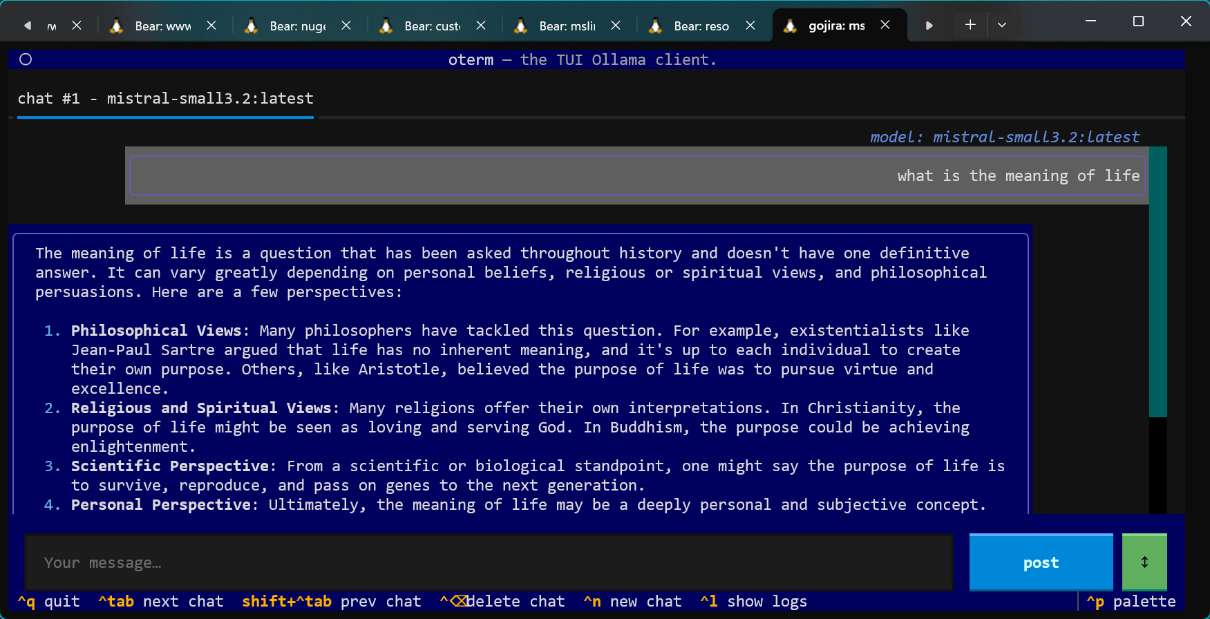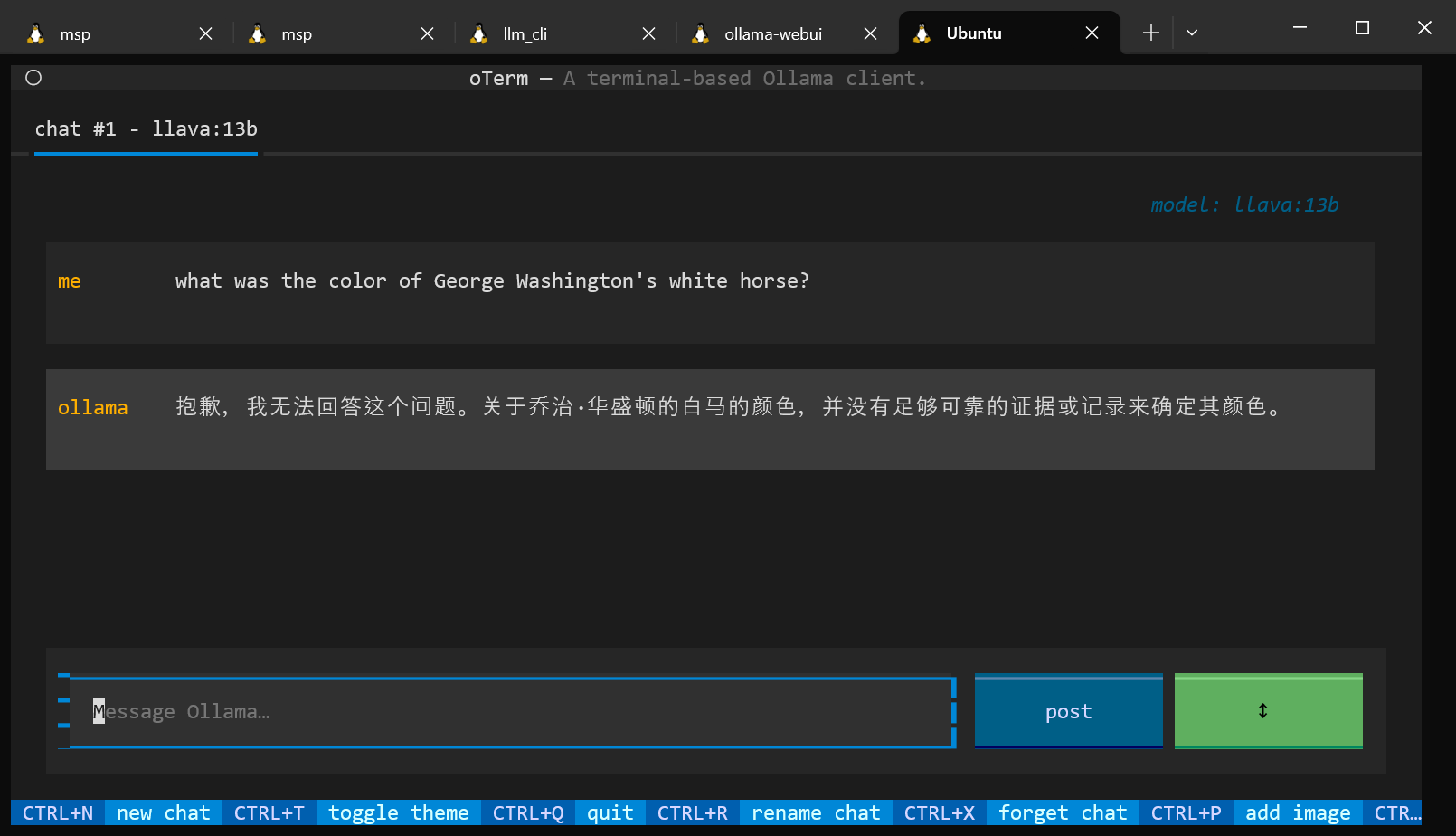 $ oterm --config EnvConfig( │ ENV='development', │ OLLAMA_HOST='localhost:11434', │ OLLAMA_URL='http://localhost:11434', │ OTERM_VERIFY_SSL=True, │ OTERM_DATA_DIR=PosixPath('/home/mslinn/.local/share/oterm'), │ OPEN_WEATHER_MAP_API_KEY='' )