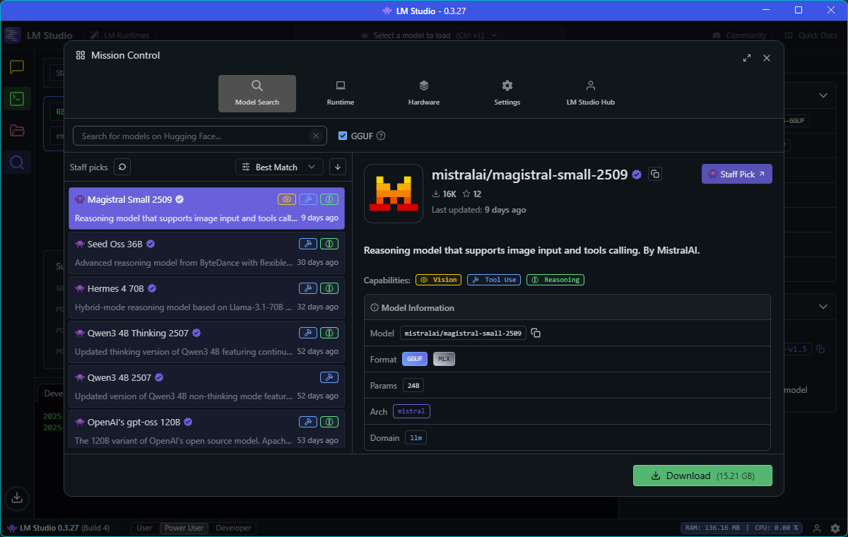 The standalone application is available for Windows, macOS, and Linux. It can run many local AI models from Hugging Face. LM Studio primarily works with models in the GGUF format, which is a specialized format optimized for running large language models on local hardware, often utilizing CPU or GPU processing. While LM Studio also supports MLX models for Apple Silicon, GGUF remains the most widely supported model format.