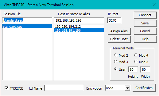 Here is the window that Vista TN3270 displays so a user can specify the IP address and port of the IBM host to connect to: