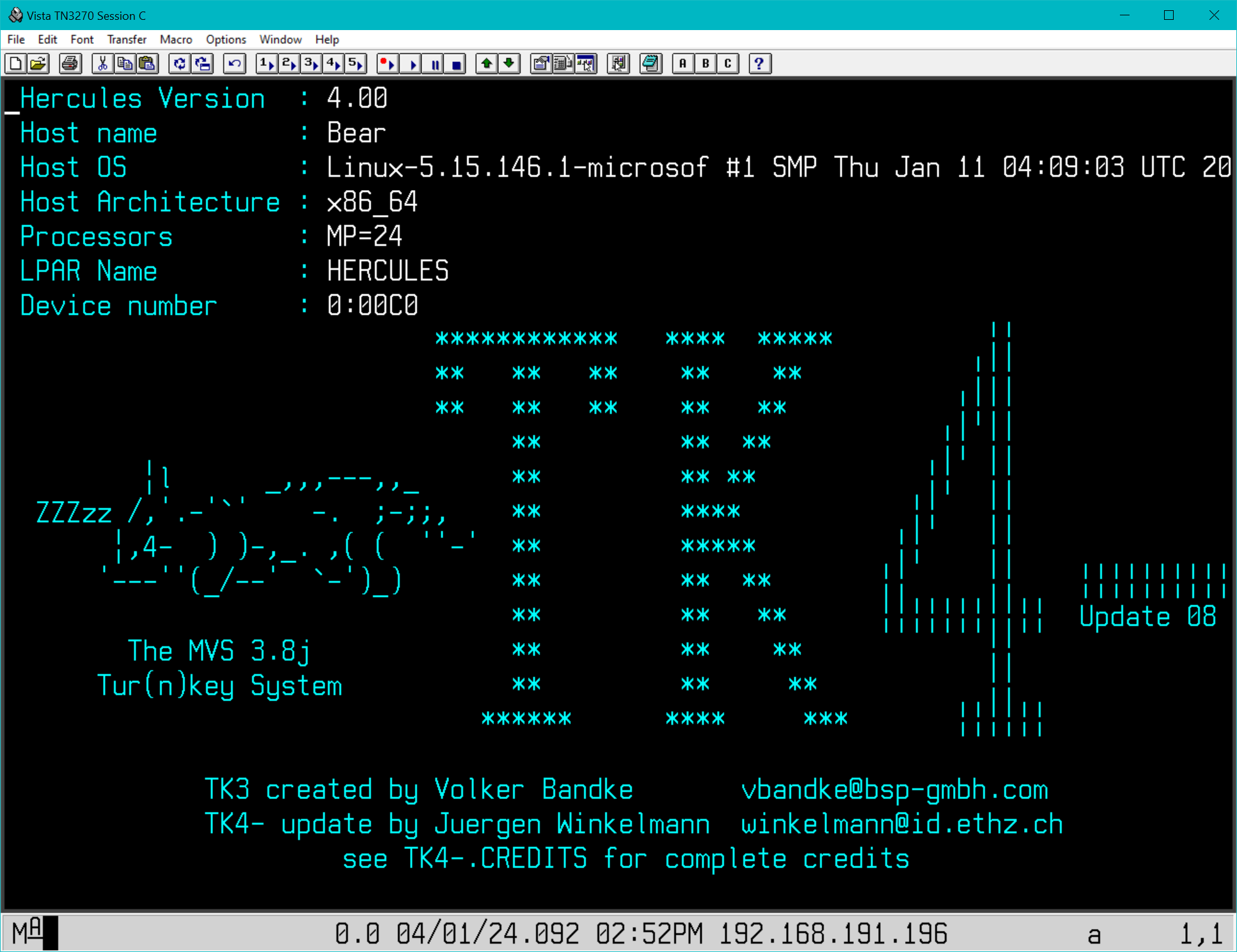 $ mvs HHC01413I Hercules version 4.00 HHC01414I (c) Copyright 1999-2012 by Roger Bowler, Jan Jaeger, and others HHC01415I Built on Jun 23 2016 at 20:32:29 HHC01416I Build information: HHC01417I Hercules for TK4- (64-bit Linux) HHC01417I Modes: S/370 ESA/390 z/Arch HHC01417I Max CPU Engines: 8 HHC01417I Using setresuid() for setting privileges HHC01417I Using POSIX threads Threading Model HHC01417I Using Error-Checking Mutex Locking Model HHC01417I With Dynamic loading support HHC01417I Using shared libraries HHC01417I With External GUI support HHC01417I With IPV6 support HHC01417I With HTTP Server support HHC01417I With sqrtl support HHC01417I With SIGABEND handler HHC01417I With CCKD BZIP2 support HHC01417I With HET BZIP2 support HHC01417I With ZLIB support HHC01417I With Regular Expressions support HHC01417I Without Object REXX support HHC01417I Without Regina REXX support HHC01417I With Automatic Operator support HHC01417I With National Language Support HHC01417I Machine dependent assists: cmpxchg1 cmpxchg4 cmpxchg8 HHC01417I Running on gojira Linux-6.2.0-27-generic. #28-Ubuntu SMP PREEMPT_DYNAMIC Wed Jul 12 22:39:5, x86_64 MP=8 HHC01413I Hercules version 4.00 HHC01414I (c) Copyright 1999-2012 by Roger Bowler, Jan Jaeger, and others HHC01415I Built on Jun 23 2016 at 20:32:29 HHC01416I Build information: HHC01417I Hercules for TK4- (64-bit Linux) HHC01417I Modes: S/370 ESA/390 z/Arch HHC01417I Max CPU Engines: 8 HHC01417I Using setresuid() for setting privileges HHC01417I Using POSIX threads Threading Model HHC01417I Using Error-Checking Mutex Locking Model HHC01417I With Dynamic loading support HHC01417I Using shared libraries HHC01417I With External GUI support HHC01417I With IPV6 support HHC01417I With HTTP Server support HHC01417I With sqrtl support HHC01417I With SIGABEND handler HHC01417I With CCKD BZIP2 support HHC01417I With HET BZIP2 support HHC01417I With ZLIB support HHC01417I With Regular Expressions support HHC01417I Without Object REXX support HHC01417I Without Regina REXX support HHC01417I With Automatic Operator support HHC01417I With National Language Support HHC01417I Machine dependent assists: cmpxchg1 cmpxchg4 cmpxchg8 HHC01417I Running on gojira Linux-6.2.0-27-generic. #28-Ubuntu SMP PREEMPT_DYNAMIC Wed Jul 12 22:39:5, x86_64 MP=8 HHC00100I Thread id 7F71411FF6C0, prio 15, name Processor CP00 started HHC00100I Thread id 7F7140DFF6C0, prio 0, name Timer started HHC00811I Processor CP00: architecture mode z/Arch HHC00136W Error in function setenv(): cannot set CUU: Not thread safe--setting disabled HHC01802I HTTP server using root directory /var/tk4-/hercules/httproot/ HHC01807I HTTP server signaled to start HHC00100I Thread id 7F71409FF6C0, prio 4, name HTTP server started HHC01802I HTTP server using root directory /var/tk4-/hercules/httproot/ HHC01803I HTTP server waiting for requests on port 8038 HHC01042I 0:000C COMM: device bound to socket 3505 HHC00100I Thread id 7F71405FF6C0, prio 0, name Socket device listener started HHC01437I Config file[45] conf/tk4-.cnf: including file conf/intcons.cnf HHC00100I Thread id 7F71401FF6C0, prio 4, name Console connection started HHC01024I Waiting for console connections on port 3270 HHC01437I Config file[71] conf/tk4-.cnf: including file conf/tk4-_default.cnf HHC00971I 0:0610 CTC: connect to 127.0.0.1:18610 failed, starting server HHC00971I 0:0611 CTC: connect to 127.0.0.1:18611 failed, starting server HHC00100I Thread id 7F713A3FF6C0, prio 0, name 3705 device(1:0660) thread started HHC01004I 0:0660 COMM: listening on port 37051 for incoming TCP connections HHC01004I 0:0661 COMM: listening on port 37052 for incoming TCP connections HHC00100I Thread id 7F7139BFF6C0, prio 0, name 3705 device(1:0661) thread started HHC01004I 0:0662 COMM: listening on port 37053 for incoming TCP connections HHC00100I Thread id 7F71393FF6C0, prio 0, name 3705 device(1:0662) thread started HHC01004I 0:0663 COMM: listening on port 37054 for incoming TCP connections HHC00100I Thread id 7F7138BFF6C0, prio 0, name 3705 device(1:0663) thread started HHC01004I 0:0664 COMM: listening on port 37055 for incoming TCP connections HHC00100I Thread id 7F71386FE6C0, prio 0, name 3705 device(1:0664) thread started HHC01004I 0:0665 COMM: listening on port 37056 for incoming TCP connections HHC00100I Thread id 7F71384FC6C0, prio 0, name 3705 device(1:0665) thread started HHC01004I 0:0666 COMM: listening on port 37057 for incoming TCP connections HHC00100I Thread id 7F71382FA6C0, prio 0, name 3705 device(1:0666) thread started HHC01004I 0:0667 COMM: listening on port 37058 for incoming TCP connections HHC00100I Thread id 7F70E3FFF6C0, prio 0, name 3705 device(1:0667) thread started HHC01004I 0:0668 COMM: listening on port 37911 for incoming TCP connections HHC00100I Thread id 7F70E3DFD6C0, prio 0, name 3705 device(1:0668) thread started HHC01004I 0:0669 COMM: listening on port 37912 for incoming TCP connections HHC00100I Thread id 7F70E3BFB6C0, prio 0, name 3705 device(1:0669) thread started HHC01004I 0:066A COMM: listening on port 37913 for incoming TCP connections HHC00100I Thread id 7F70E39F96C0, prio 0, name 3705 device(1:066A) thread started HHC01004I 0:066B COMM: listening on port 37914 for incoming TCP connections HHC00100I Thread id 7F70E37F76C0, prio 0, name 3705 device(1:066B) thread started HHC00100I Thread id 7F70E33FF6C0, prio 4, name 0:0670 communication thread started HHC01004I 0:0670 COMM: listening on port 37801 for incoming TCP connections HHC00100I Thread id 7F70E32FE6C0, prio 4, name 0:0671 communication thread started HHC01004I 0:0671 COMM: listening on port 37802 for incoming TCP connections HHC00100I Thread id 7F70E31FD6C0, prio 4, name 0:0672 communication thread started HHC01004I 0:0672 COMM: listening on port 37803 for incoming TCP connections HHC00100I Thread id 7F70E30FC6C0, prio 4, name 0:0673 communication thread started HHC01004I 0:0673 COMM: listening on port 37804 for incoming TCP connections HHC00100I Thread id 7F70E2FFB6C0, prio 4,