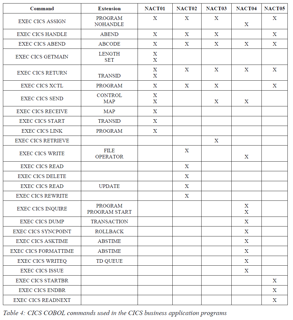The thesis explains in detail how the author worked through the book “Designing and Programming CICS Applications” and acknowledges the support he got while stationed at IBM Leipzig. Chapter 4.3, “The NACT COBOL programs and their commands”, describes the CICSADP program quite well. Page 62 of the thesis shows the CICS commands used by the various components of the program: