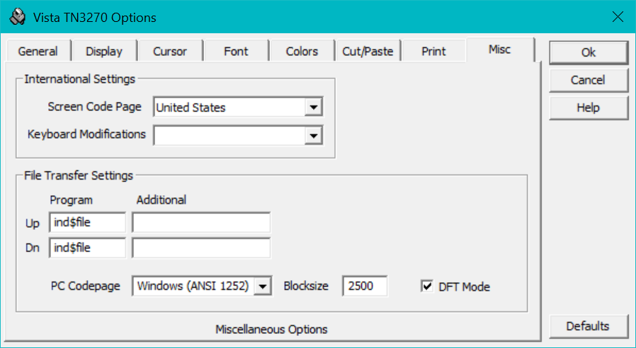 I did not change the default Vista TN3270 settings (menu item Options / Options / Misc):