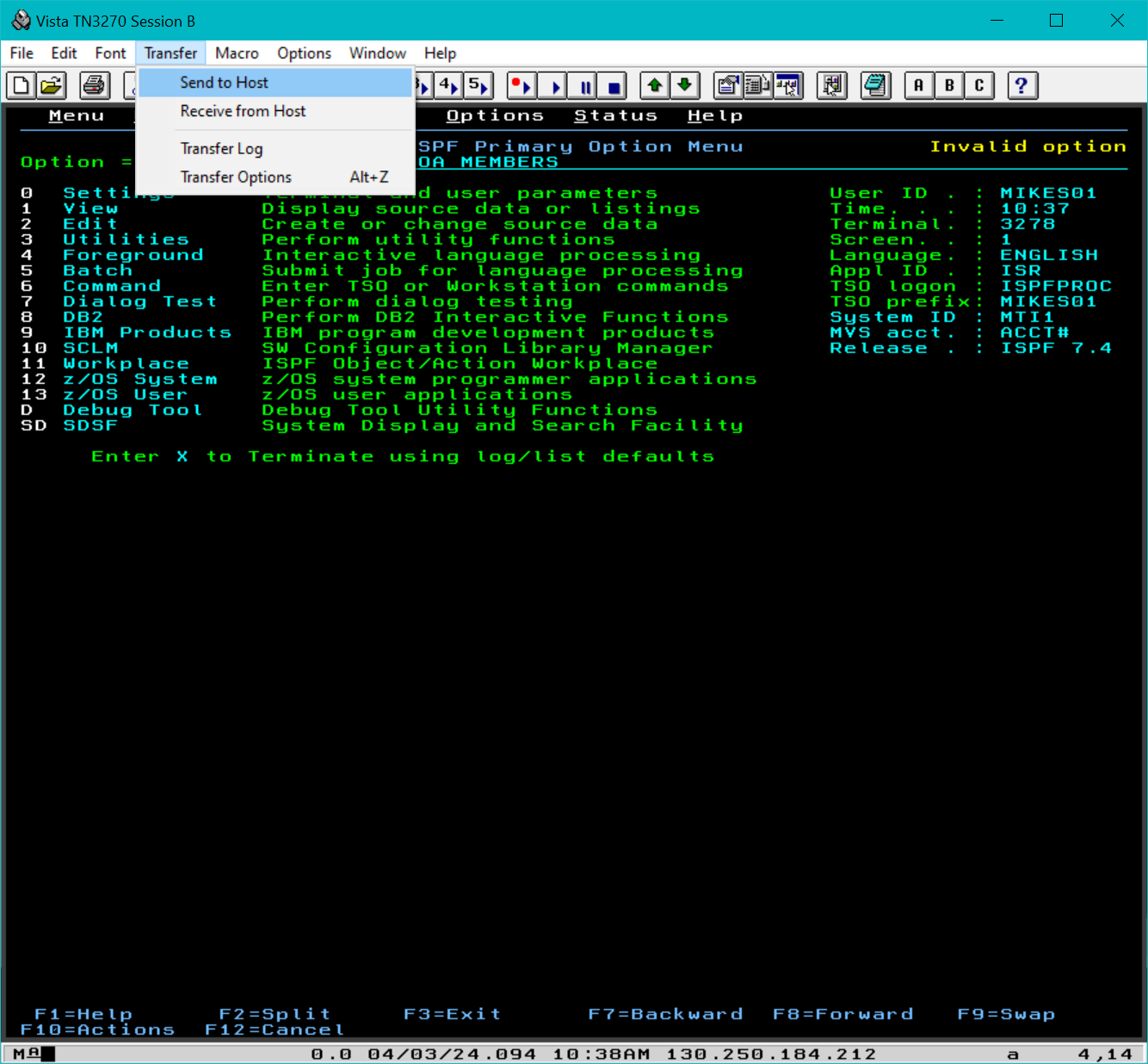 After logging on to the mainframe, ISPF must be exited by typing X and then pressing Enter.