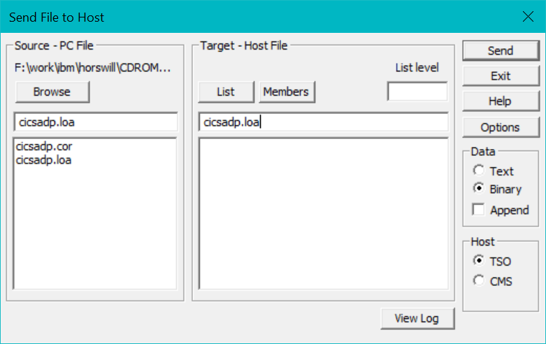 receive indsname(cicsadp.txtseq) NONAMES INMR901I Dataset CTS.V130.CICSJC.TXT from JCOUSIN on WINMVS28 INMR906A Enter restore parameters or 'DELETE' or 'END' + dsn('MIKES01.CICSADP.VSAMDATA') INMR001I Restore successful to dataset 'MIKES01.CICSADP.VSAMDATA'