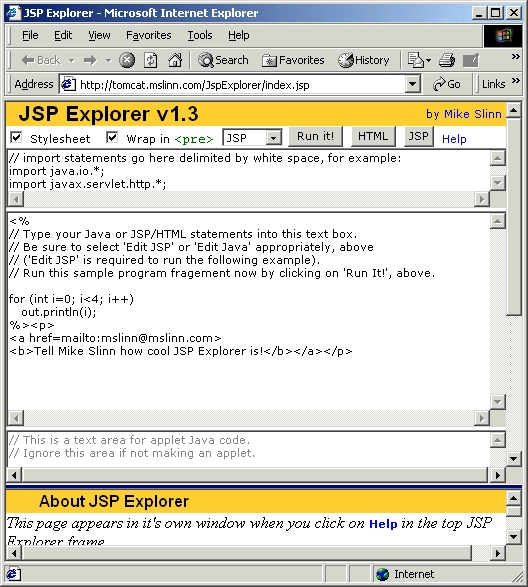 The basic operation of the JSP Explorer is fairly straightforward and intuitive. The interface consists of two frames, a text input frame where a programmer can enter his or her code, and an output frame. The output frame displays the results of the program after it is executed on the server. A ‘Run it!’ button exists in the text input frame which causes JSP Explorer to take the entered code and, according to the options set in the UI, generate a complete JSP that is displayed in the output frame.
