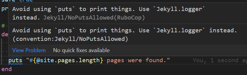 Jekyll/NoPutsAllowed: Avoid using puts to print things. Use Jekyll.logger instead.