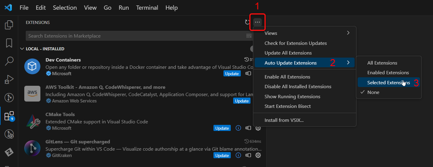Visual Studio Code v1.85.0 introduced extension auto update control. Instead of using the Visual Studio Code control palette, the More actions icon of the Extensions tab can be used to display the Auto Update Extensions menu. The icon looks like three dots, as shown in the image below. I have numbered where you need to click, in order, to selectively enable extension auto-update.