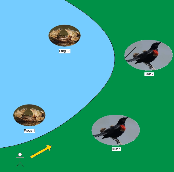 In the above diagram, there are two trees (with birds) in the green grassy/marshy area, and there were two main collections of frogs in the blue water. The location of the crickets is not shown.