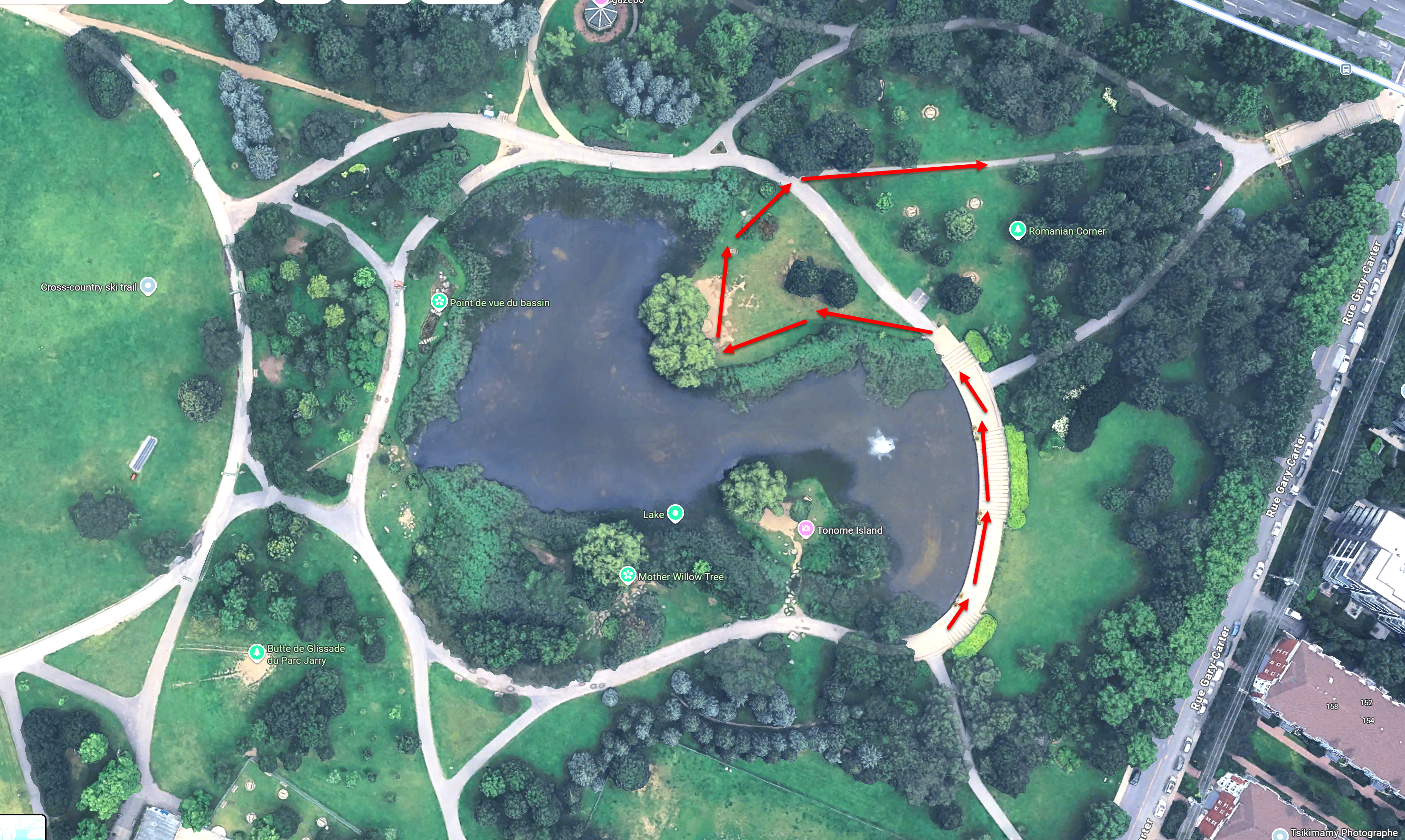 A stick person (you) is depicted at the lower left corner–you are walking counterclockwise around the pond.