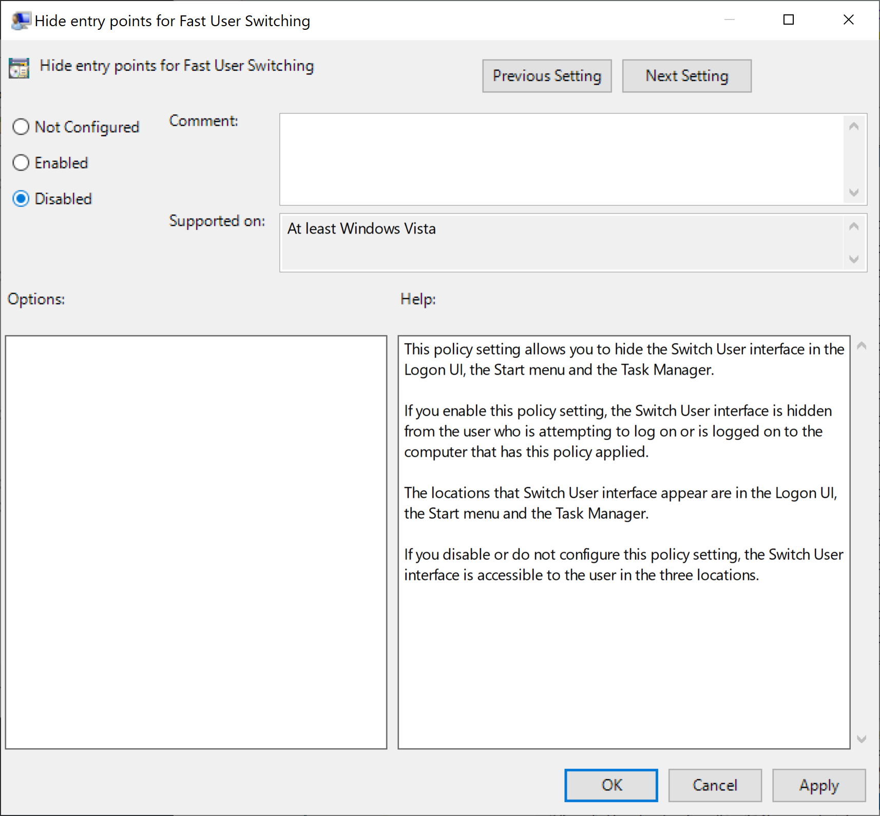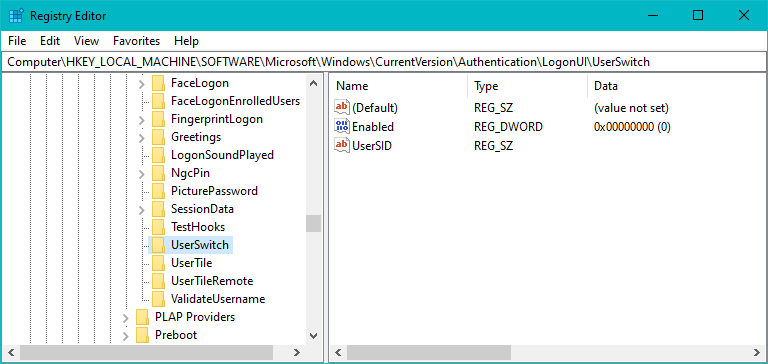 into the search bar near the top of theSOFTWARE\ Microsoft\ Windows\ CurrentVersion\ Authentication\ LogonUI\ UserSwitch regedit